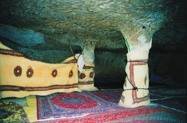 Před poledním žárem hledáme úkryt v mešitě, která je samozřejmě také celá vyhloubena do sopečného tufu. Nečekaně prostorná svatyně je vyzdobena malovanými rohožkami z plsti. Jedná se o typický výrobek místních domorodců. Ti na rozdíl od většiny ostatních Peršanů nepreferují vázané koberce, ale tyto jednoduché předložky, jež splňují stejný účel, ale jejich zhotovení není tak časově náročné.