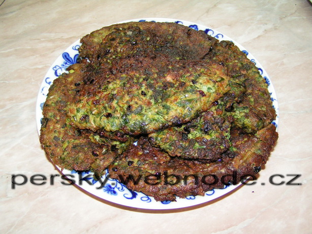 Pórek, kopr, cibulky a česnek dáme do mixéru a rozmixujeme na malé kousky, ale ne, aby z toho byla kaše. (Pokud mixér nemáte, můžete vše rozsekat nožem, ale je to celkem pracné) Poté přidáme 6-8 syrových vajec, podle toho, jak je potřeba. Hmota nesmí být moc suchá, musí být pěkně vláčná a řídká. Vejce drží všechno pěkně pohromadě. Dále přidáme veškere koření a pokud máte zerešk, přidáme i hrst zerešku. Všechno promícháme a pak již smažíme placky na mírném ohni, pánev můžeme i přikrýt pokličkou, aby se uvnitř držela pára. Pozor, ať se placky nepřipálí. Můžeme podávat s rýží a bílým jogurtem.
